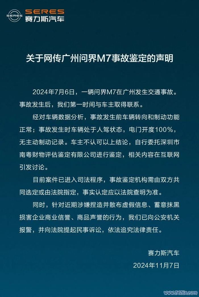 赛力斯汽车11月7日发布《关于网传广州问界M7事故鉴定的声明》称,经对车辆数据分析,事故发生前车辆转向和制动功能正常;事故发生时车辆处于人驾状态,电门开度100%,无主动制动记录。车主不认可以上结论,自行委托深圳市南粤财物评估鉴定有限公司进行鉴定,相关内容在互联网引发讨论。目前案件已进入司法程序,事故鉴定机构需由双方共同选定或由法院指定,事实认定应以法院查明为准。